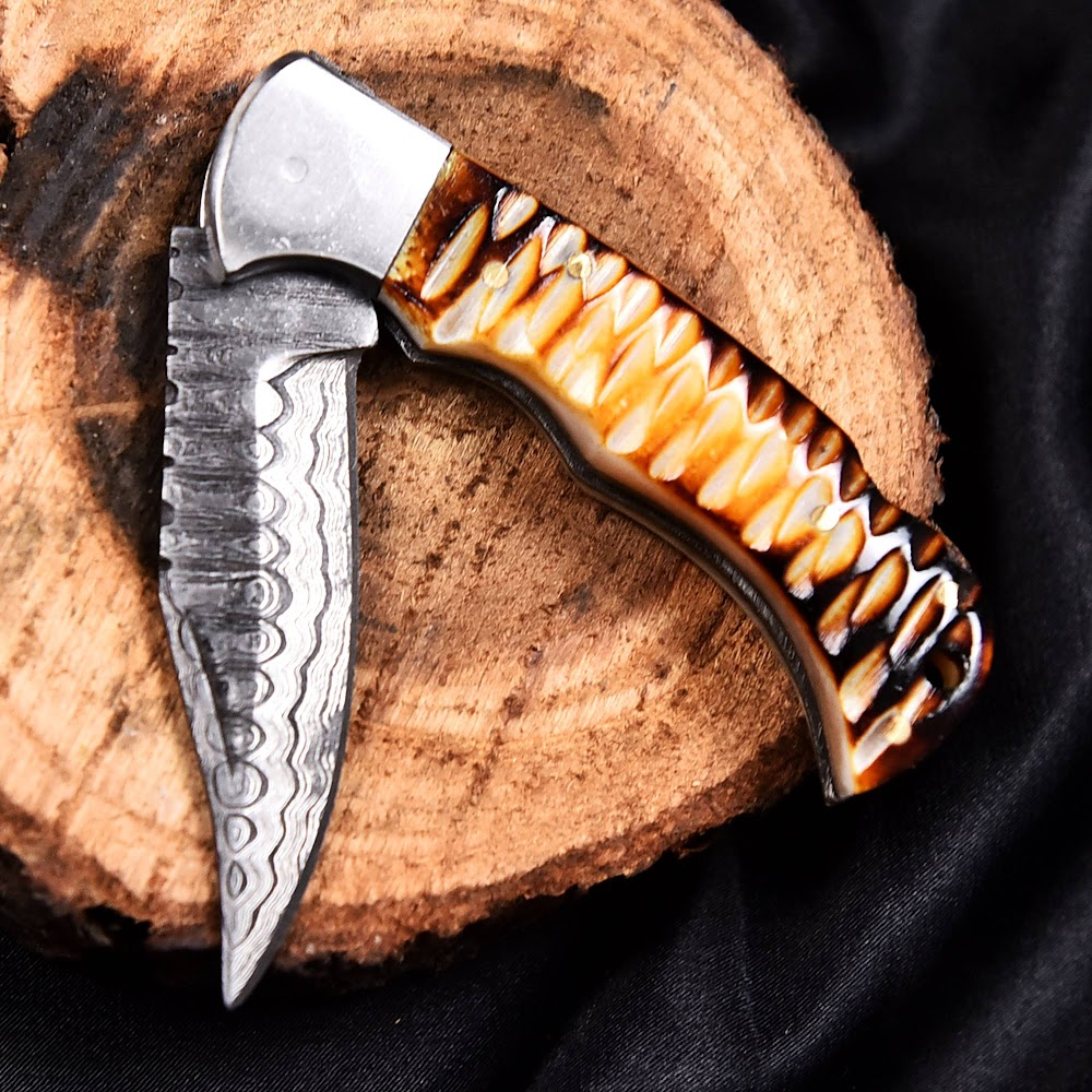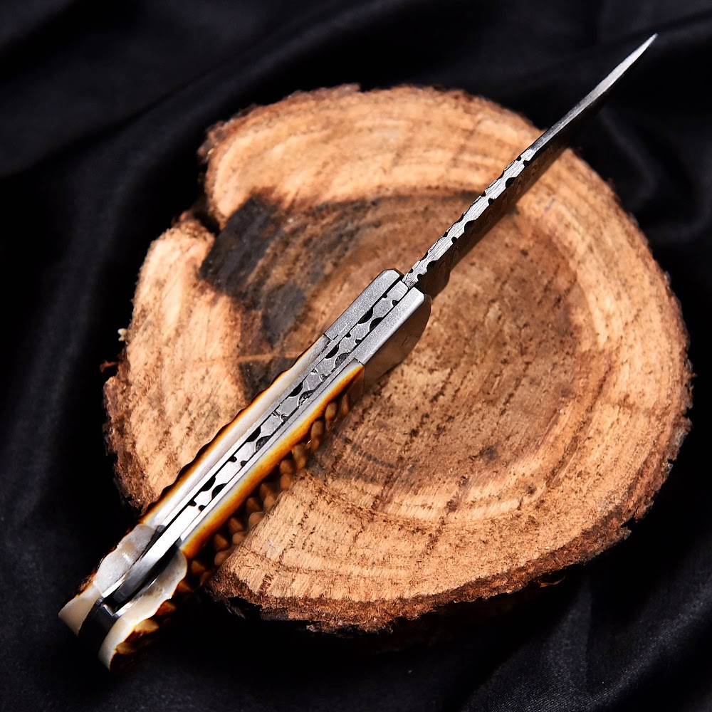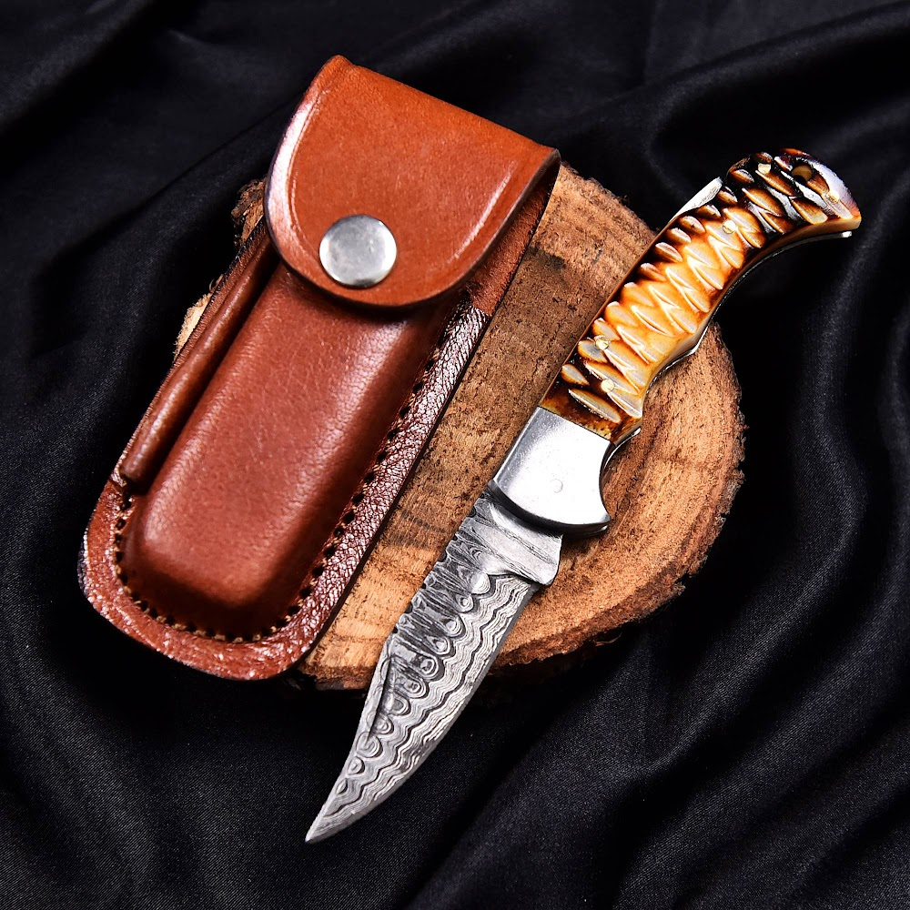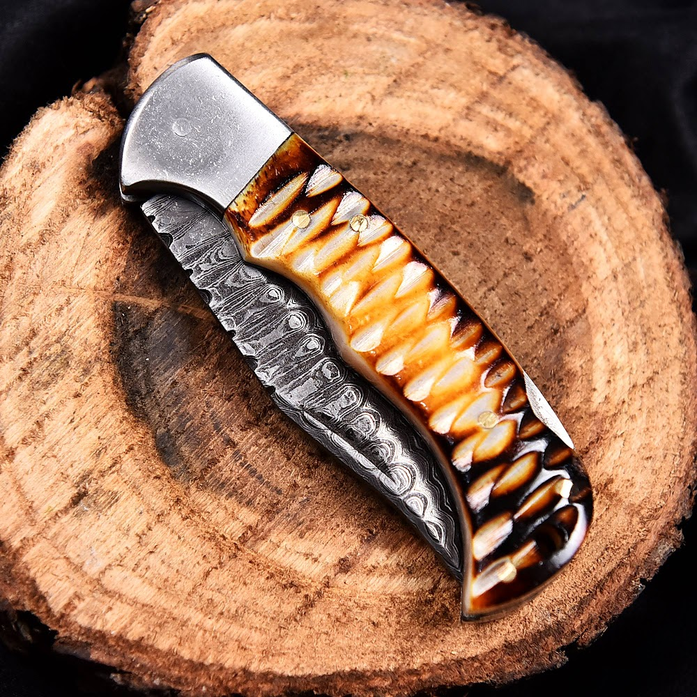 Be the first to review “Exquisite Handcrafted Damascus Steel Folding Knife with Antler Bone Handle and Intricate Blade Pattern – Perfect for Collectors”