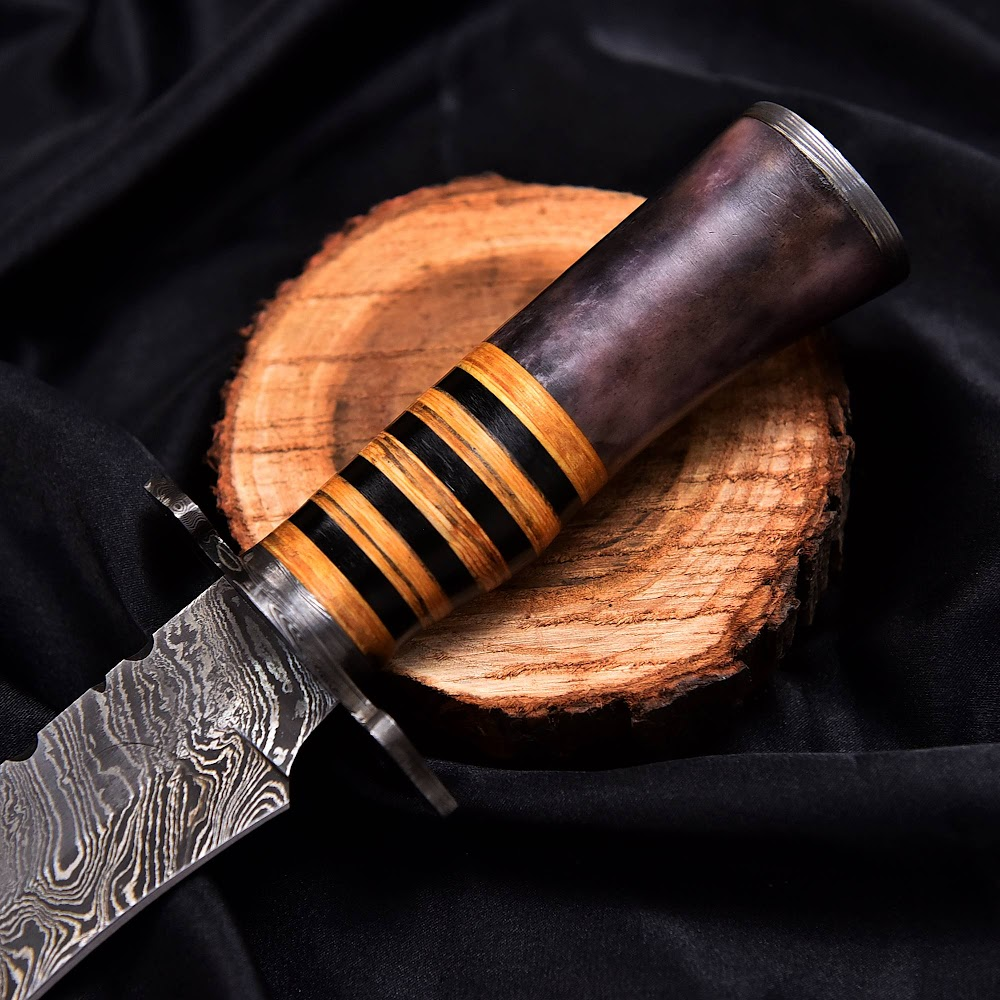– **Unique Handle**: The handle is an artful combination of contrasting woods and treated horn, providing not just a secure grip but also a striking appearance.