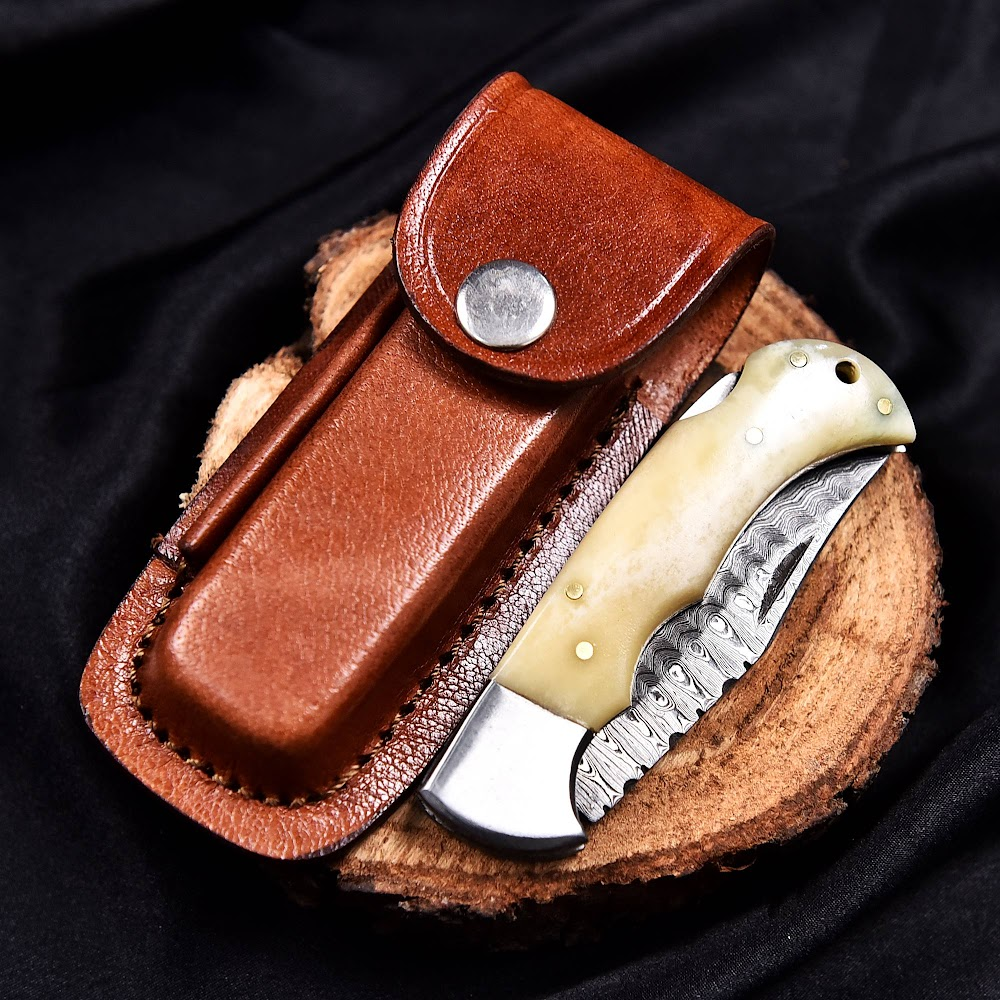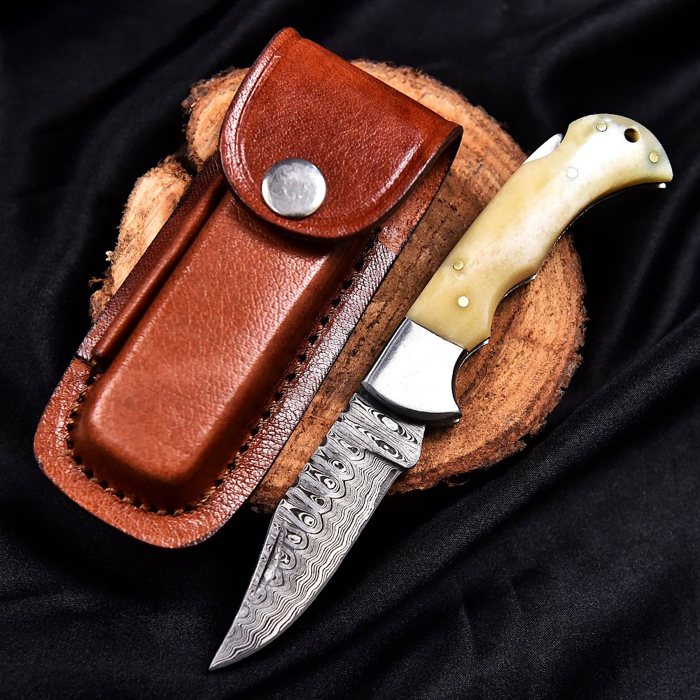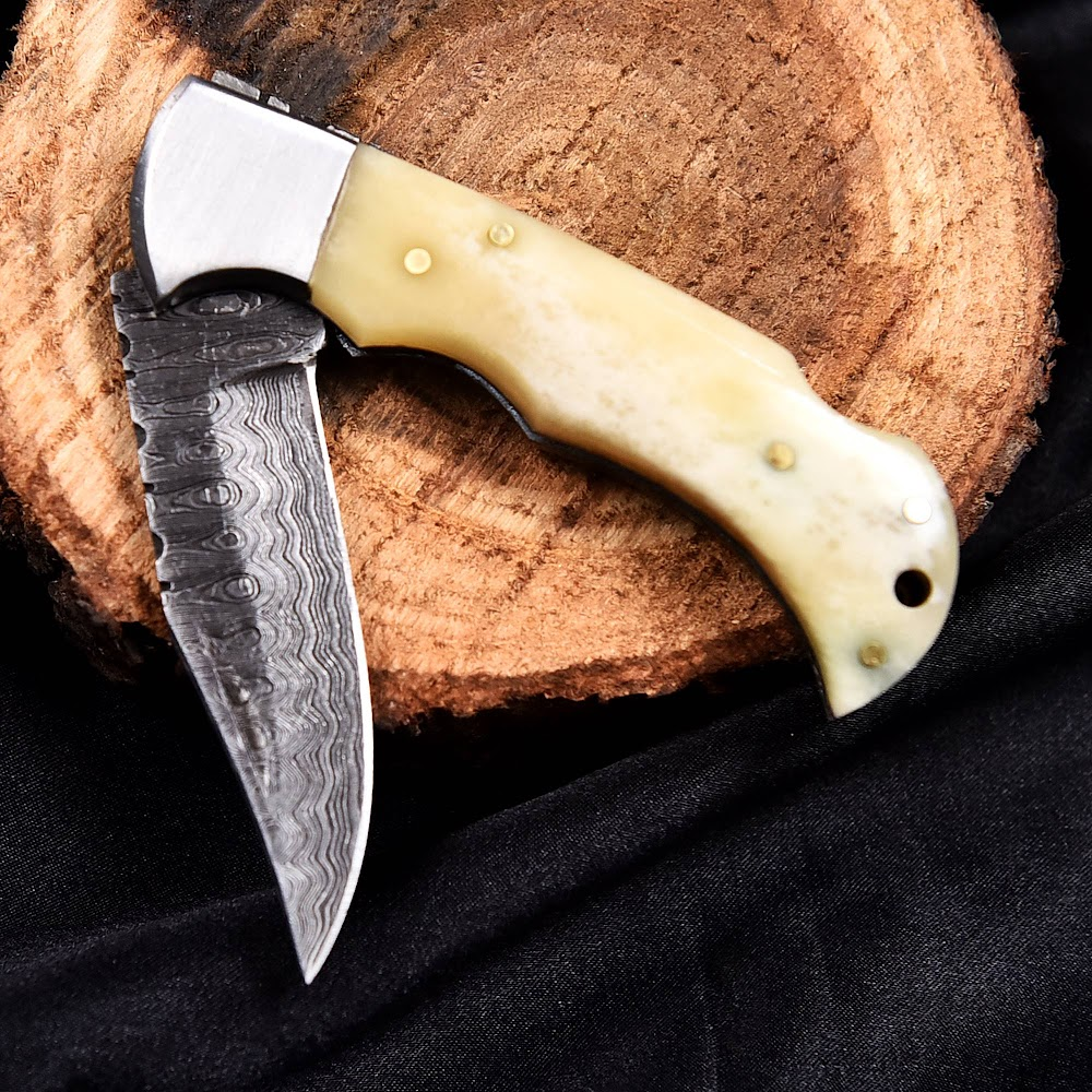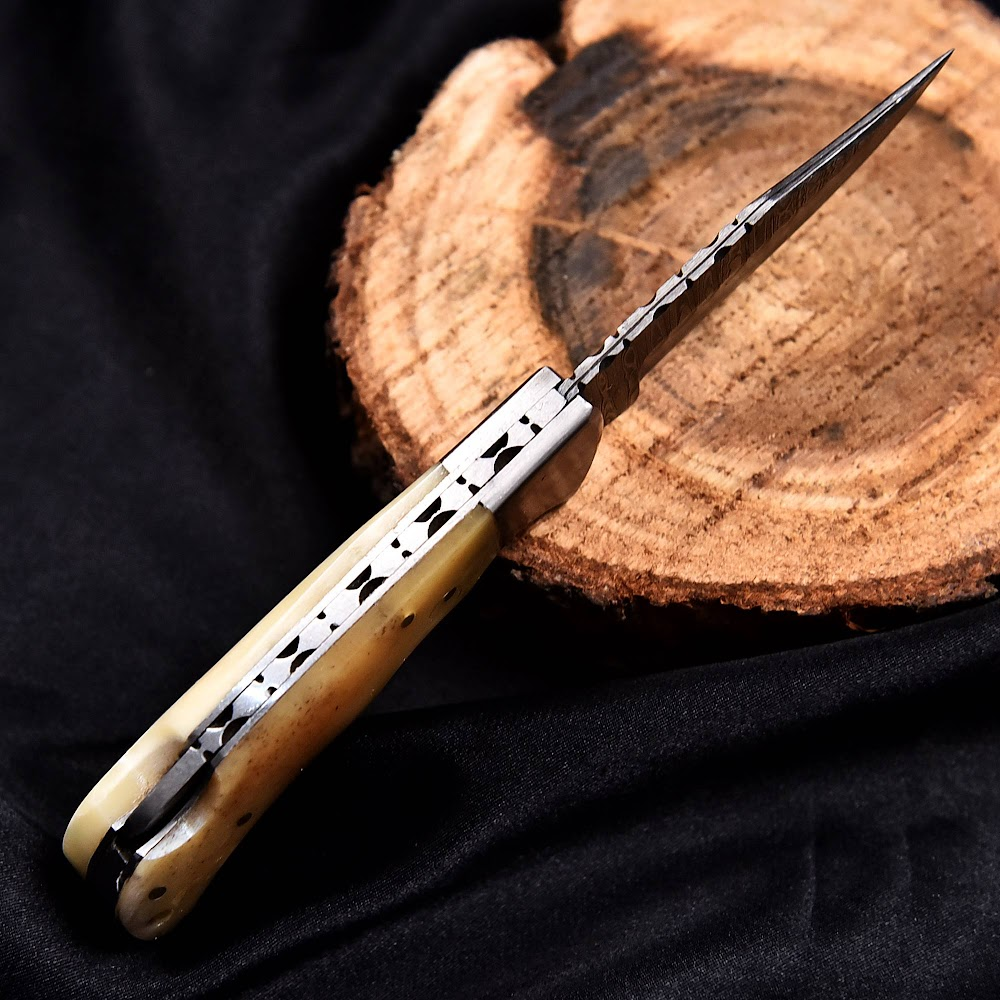 – **Handle Design:** The ergonomic bone handle offers a secure grip and striking aesthetic, allowing you to handle tasks with precision and style. Its polished finish complements the rich patterns of the Damascus blade, creating a seamless blend of beauty and functionality.