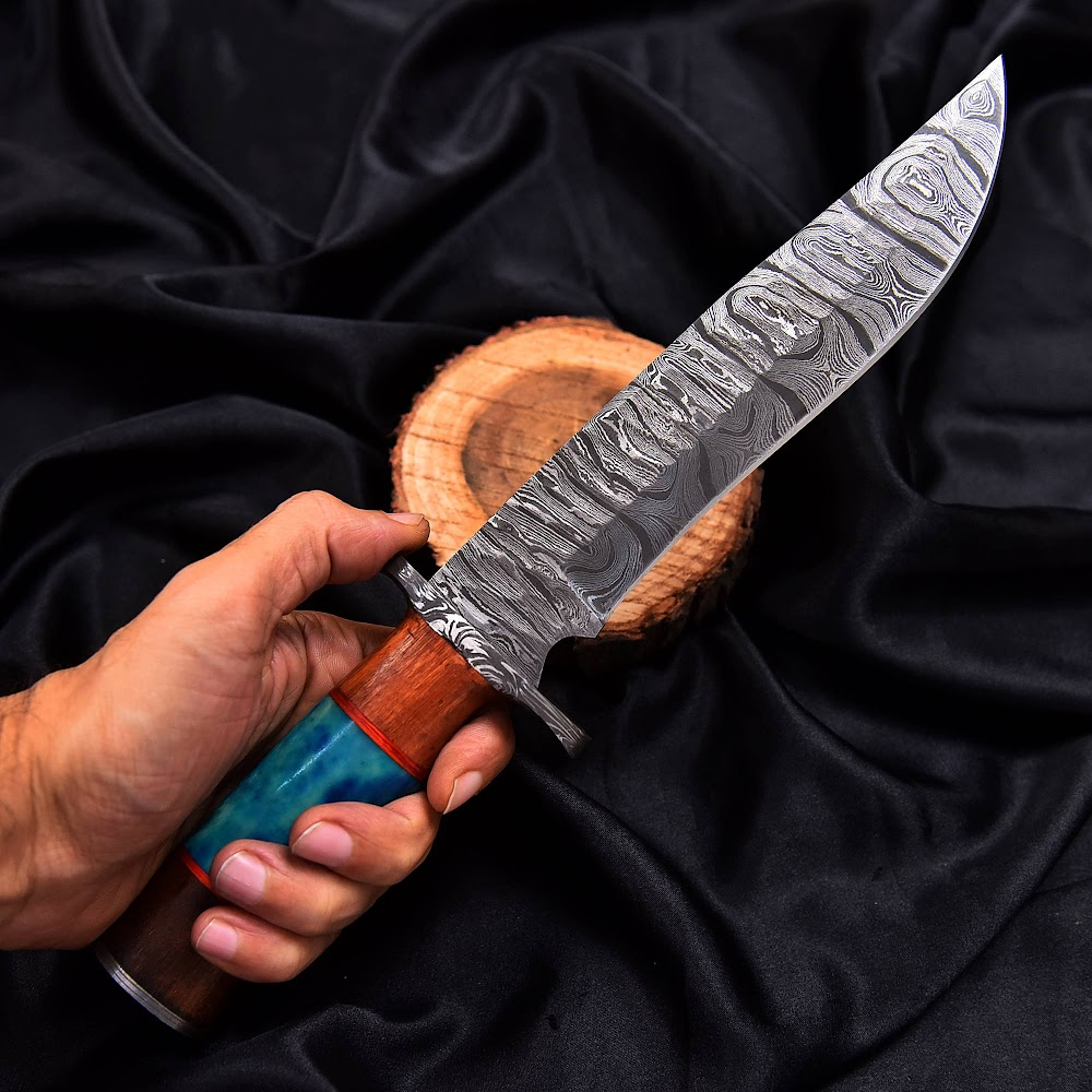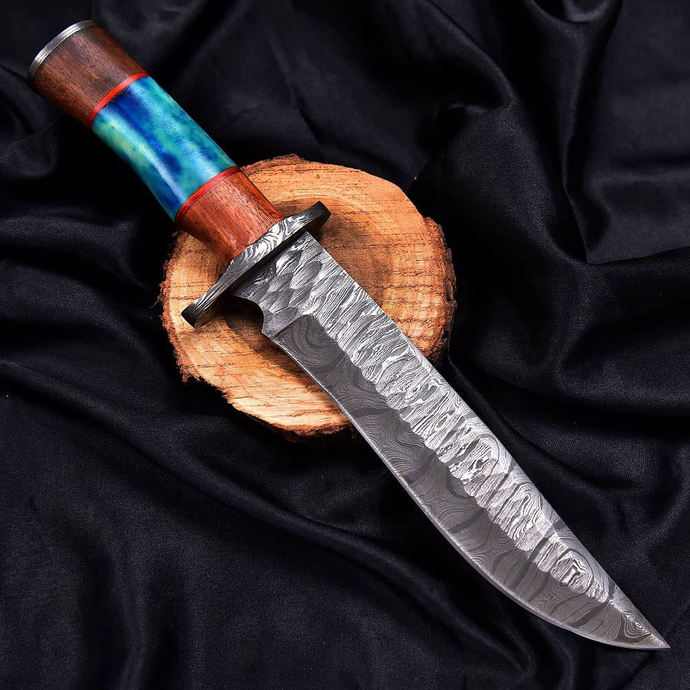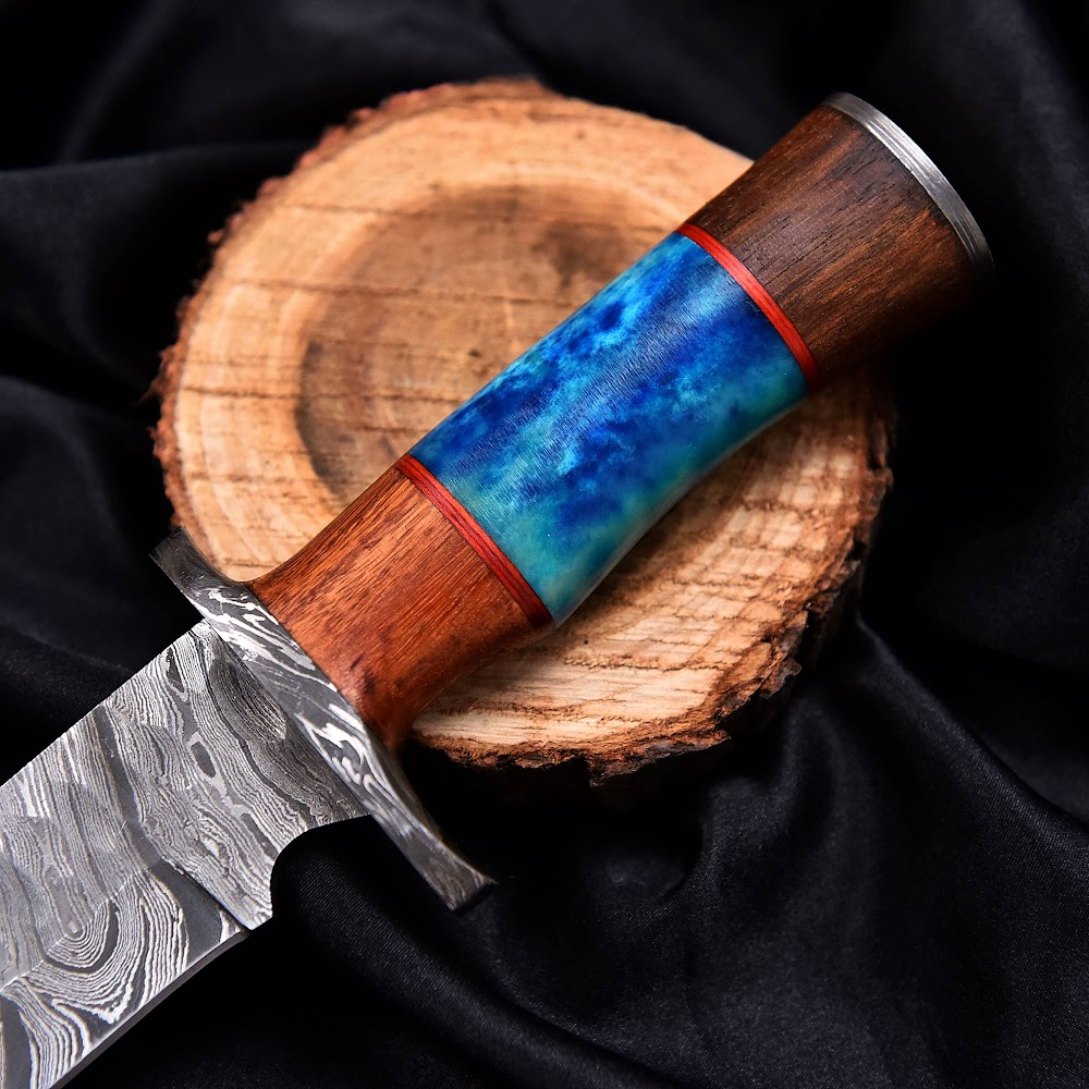 Delve into the ancient world with a blade forged from 1095 and 15N20 steel, shaped and patterned painstakingly to achieve its signature Damascus pattern. This process not only showcases a beautiful wave-like design but also ensures unparalleled durability and traditional for challenging tasks. The exquisite handle crafted from a combination of vibrant colored resin and solid wood not only adds aesthetic appeal but offers exceptional grip and comfort, making it a reliable companion in any adventure.