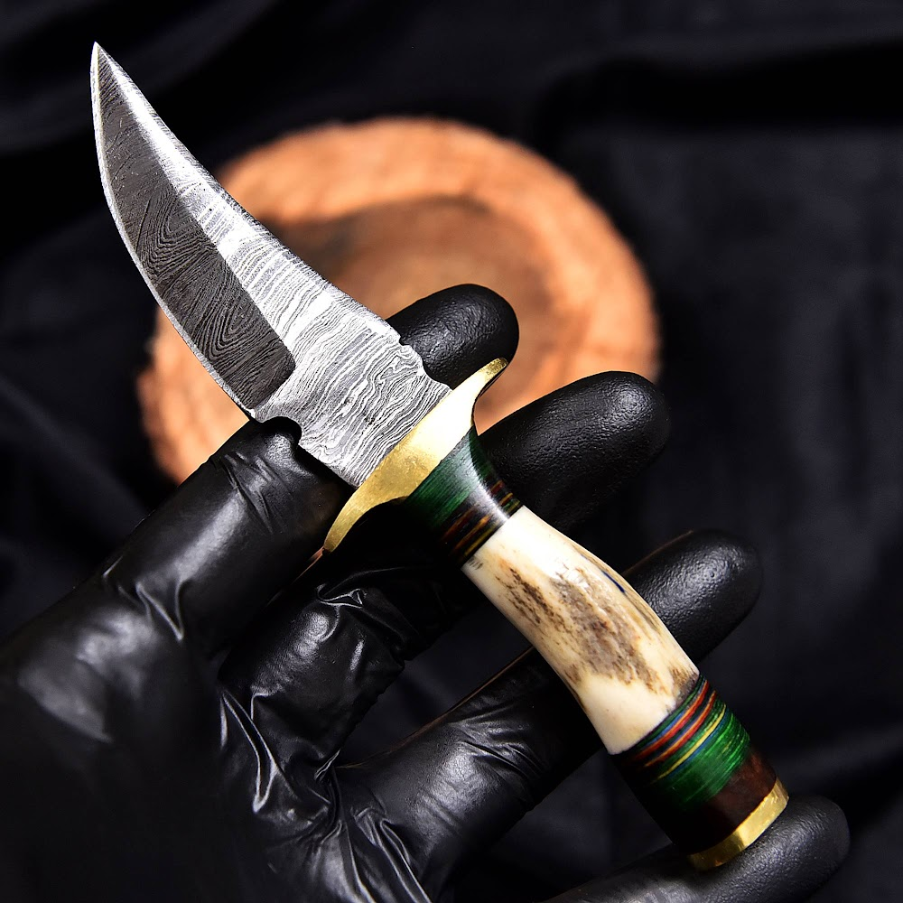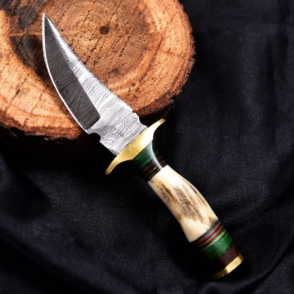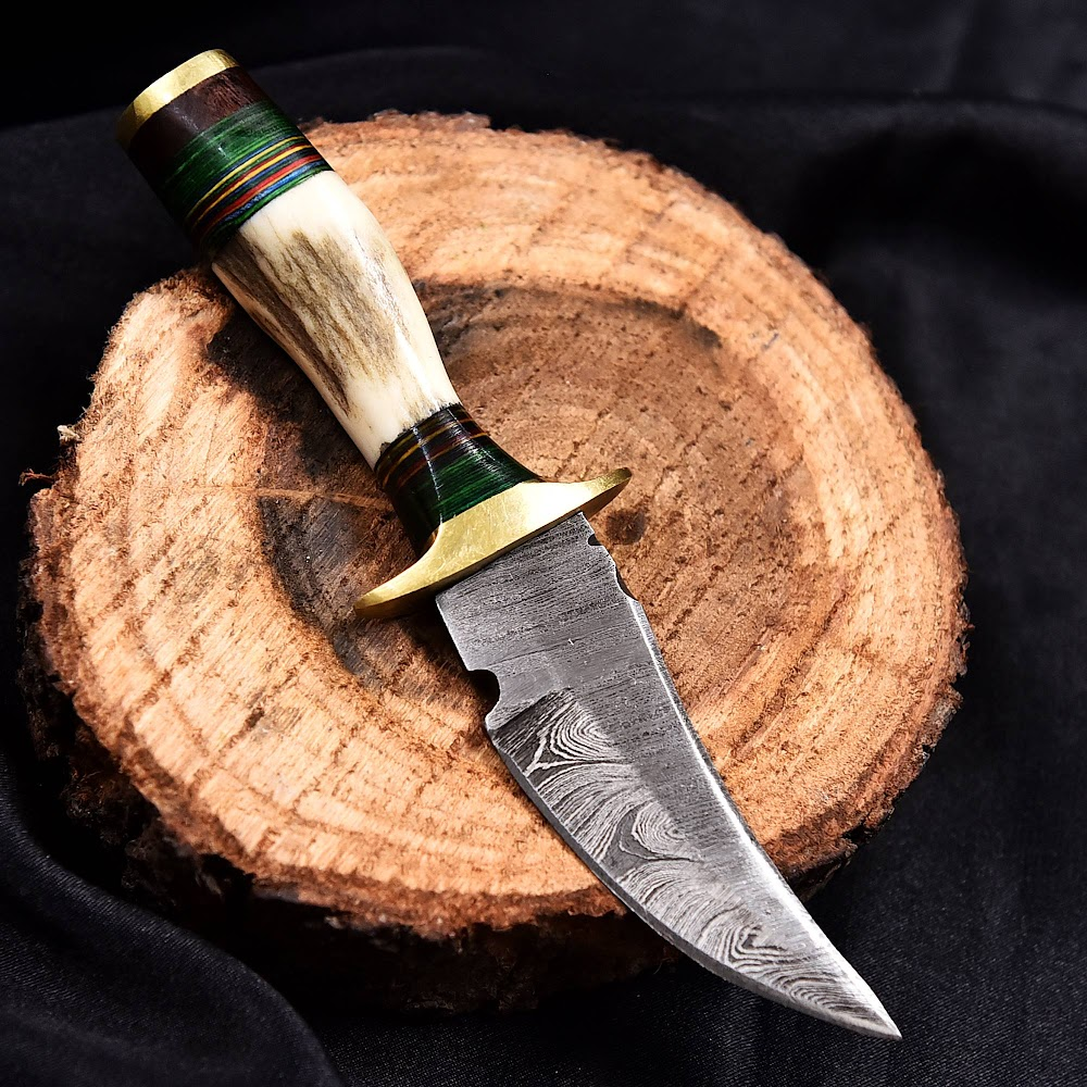 Handcrafted Damascus Steel outdoor lifestyle Knife with Polished Natural Horn Handle and Brass Guard, Perfect for Collectors and Enthusiasts