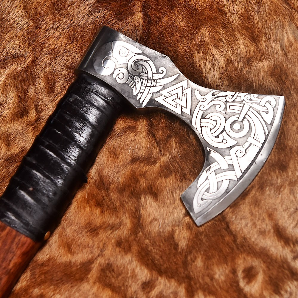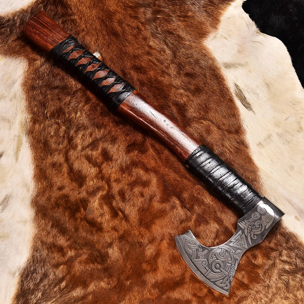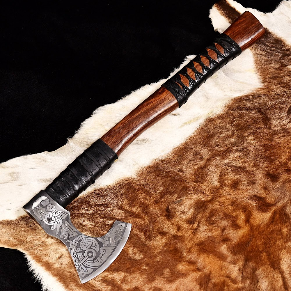 ⭐⭐⭐⭐⭐ Own a piece of ancient strength and spirit ⚔️ – This hand-forged Viking axe is where old-world craftsmanship meets raw power. Immerse yourself in history and craftsmanship with this meticulously handcrafted Viking axe. Designed for those who appreciate the art of traditional weaponry, this axe combines beauty, functionality, and a deep historical connection. The carbon steel axe head is adorned with intricate Norse engravings, capturing the essence of Viking folklore and mythology. Each pattern tells a story, reflecting the courage and resilience of the Norse warriors. The blade is not just ornamental; it is handcraft blade-sharp and ready for practical use, whether it’s for chopping wood on your next camping adventure or simply as an impressive display piece in your home.