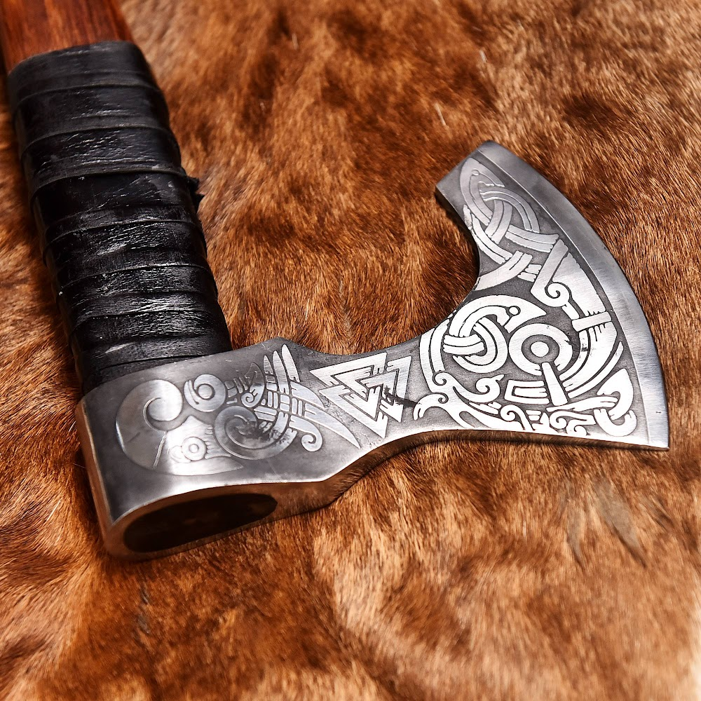 – Expertly crafted carbon steel axe head with elaborate Norse/Vegvisir engraving